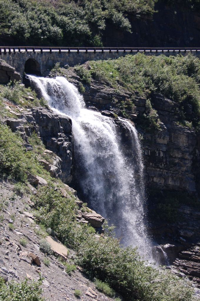 After Lake McDonald, the road goes up. And up, and up. And more up. Dramatically up. Did I mention up? Thousand foot drop-offs on one side, and glacial melt on the land side. Sometimes, it even sprayed the cars and the road. The first 10 miles or so were paved beautifully. Soon, that all changed. They’re undergoing a multi-year re-build of the Going-to-the-Sun Road. One lane passes with escorts, dusty gravel, and a little TMI about the construction process and fragility of the current road. Wow. It’s held on by a thread.