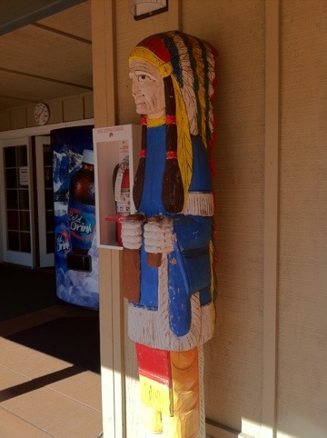 The cigar-store Indian (native American) has a fire extinguisher – just in case. Which is lucky, since all the CA DOT workers who stayed here last night smoked up a storm. And it was a symphony of beer can tab pulling.