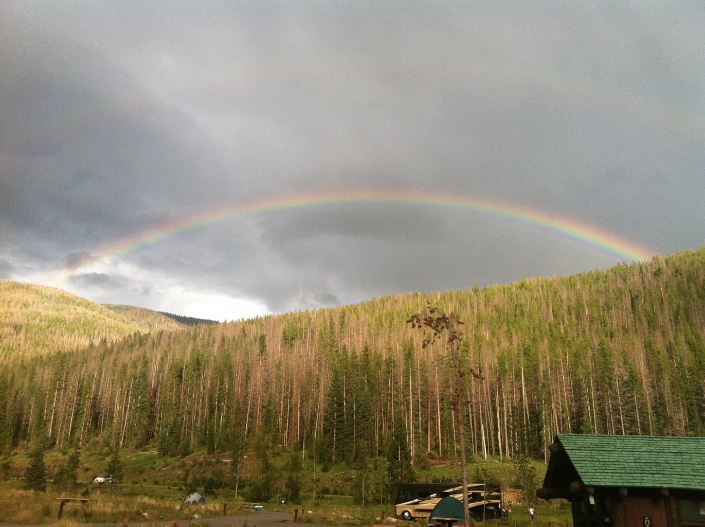 After I took this iPhone shot, I ran to get my good camera because another complete rainbow appeared above the first. I could not make this up… When I have wifi again, I’ll upload that shot.