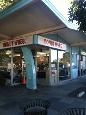 Cruelly, I took thus picture of the “donut wheel” from my parking spot on front of ladies’ workout spot, “Curves”. They have a symbiotic relationship.