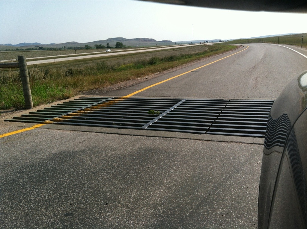 As in Wyoming, virtually all on- and off-ramps in South Dakota have cattle guards. At least on I-90. Makes braking with a trailer really fun.,,