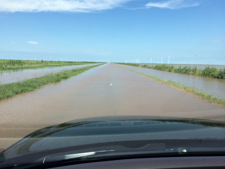 There were warnings about water on the road, and I asked a Texas DOT worker stopped in a truck just how deep it was. He said just 3 inches, so I decided to plow through. The prairies were soaked to the bone, and most Fields were newly formed lakes. Look in my rearview mirror in the video below, and see how deep you think it is.
