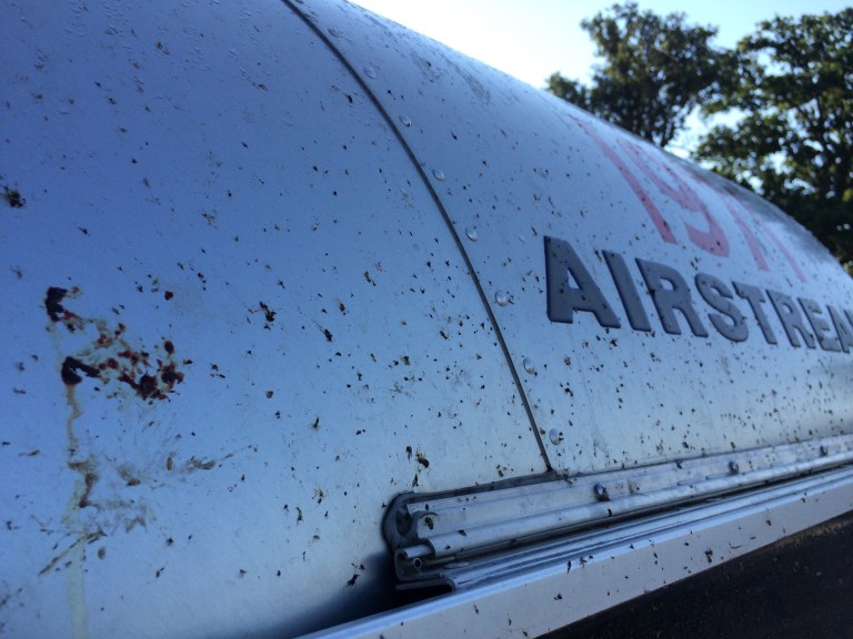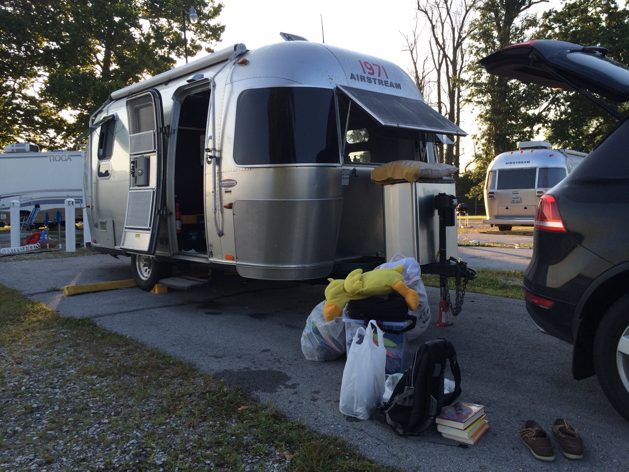Arrived at Airstream in Jackson Center, OH after sunset last night and got one of the last sites in the Terraport Since I need to leave the trailer for a least a month, everything must get unpacked and put in the car: food, towels, clothes, Huggy Pillow…