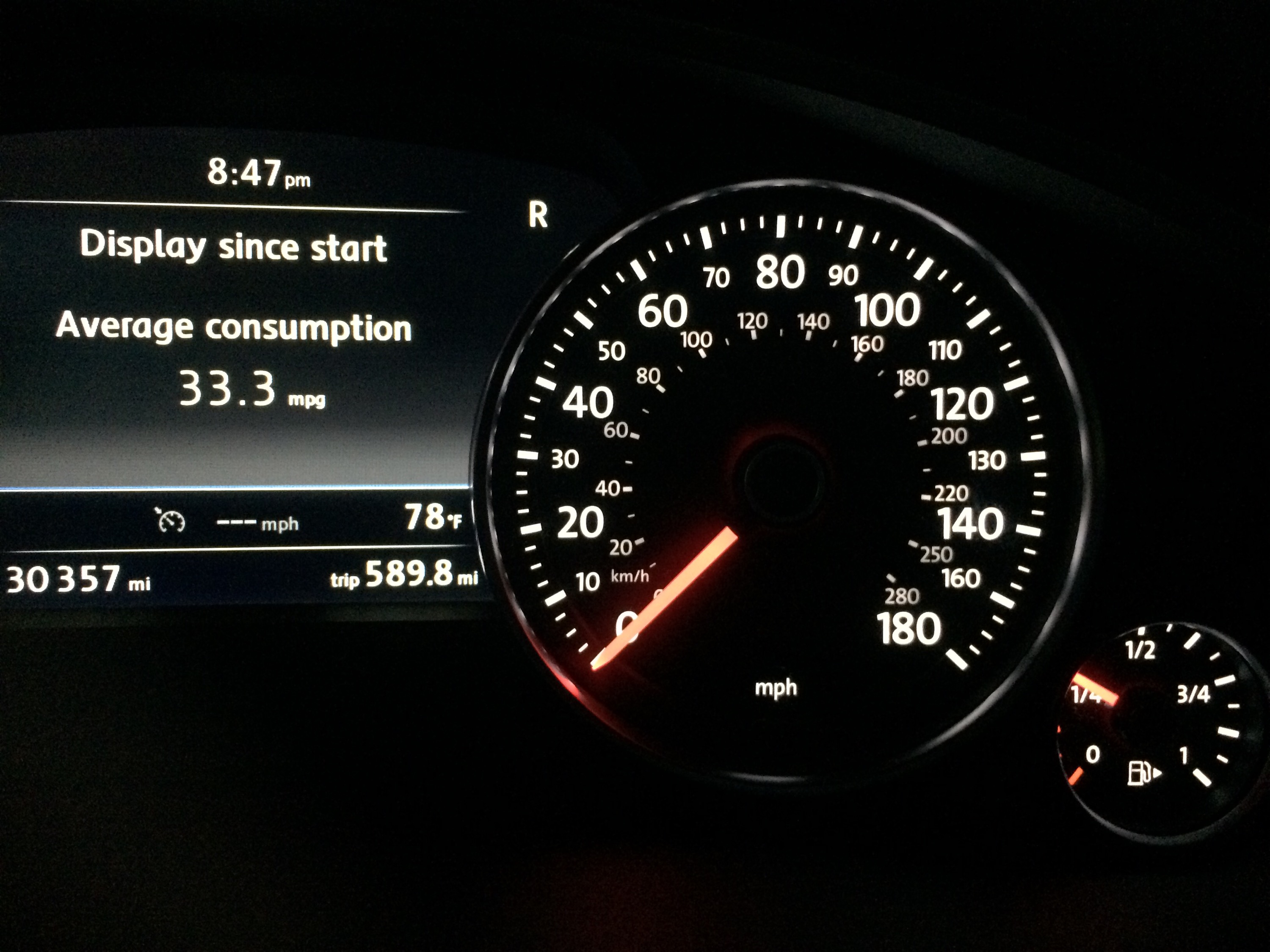 Meanwhile, without 4,000 pounds missing behind the Touareg, 590 miles go by at 33.3mpg, and I still have a quarter tank when I get home.