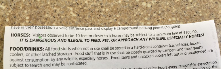 Despite posted warnings, it seems every visitor’s favorite pastime is to feed, pet, and approach these horses. On my way in, I witnessed an SUV full of teenage girls, bags of Skittles in hand, reenacting a scene I imagine they saw in the My Little Pony video, within view of one of those signs. Everyone does it. They’re irresistible. As I’m writing this, a pair walk by my trailer window.