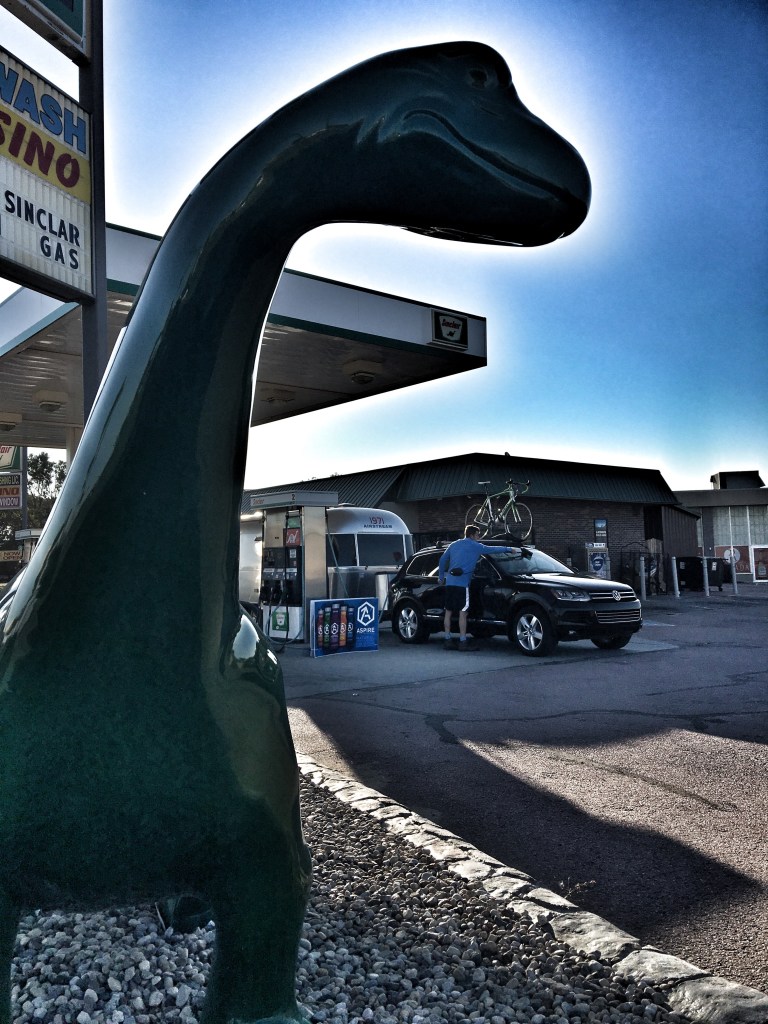 On the way out of Mitchell, we fill up on dinosaur juice in the shadow of corn-fed Sinclair spokesmodel, “Dino“.