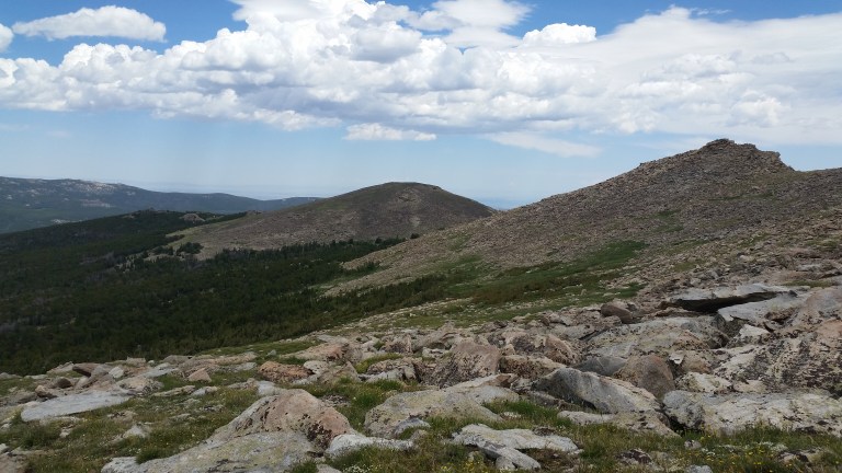 I thought I could intercept the trail home over this single mountain, but there was another one I had to go over. Once over the top of the first mountain the wind ceased, which allowed the mosquitos to unleash a withering attack. I was prepared to defend myself against bears, but left the bug spray at home. It got so bad at one point I considered using the bear spray, but then came to my senses before trying to kill a couple of the thousands of mosquitos with a whole bottle of bear spray.