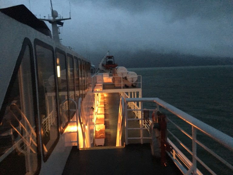 It got dark soon after I boarded, and I was surprised at how uneasy plowing the dark waters in the extreme wind made me feel. I had to hold onto the railing to not be blown over. Maybe that’s why I was the only one on deck.