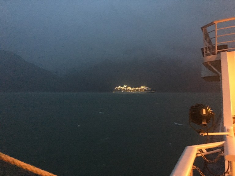 The cruise ship rounding the bend ahead of looked eerie in the fog, with just their lights showing.