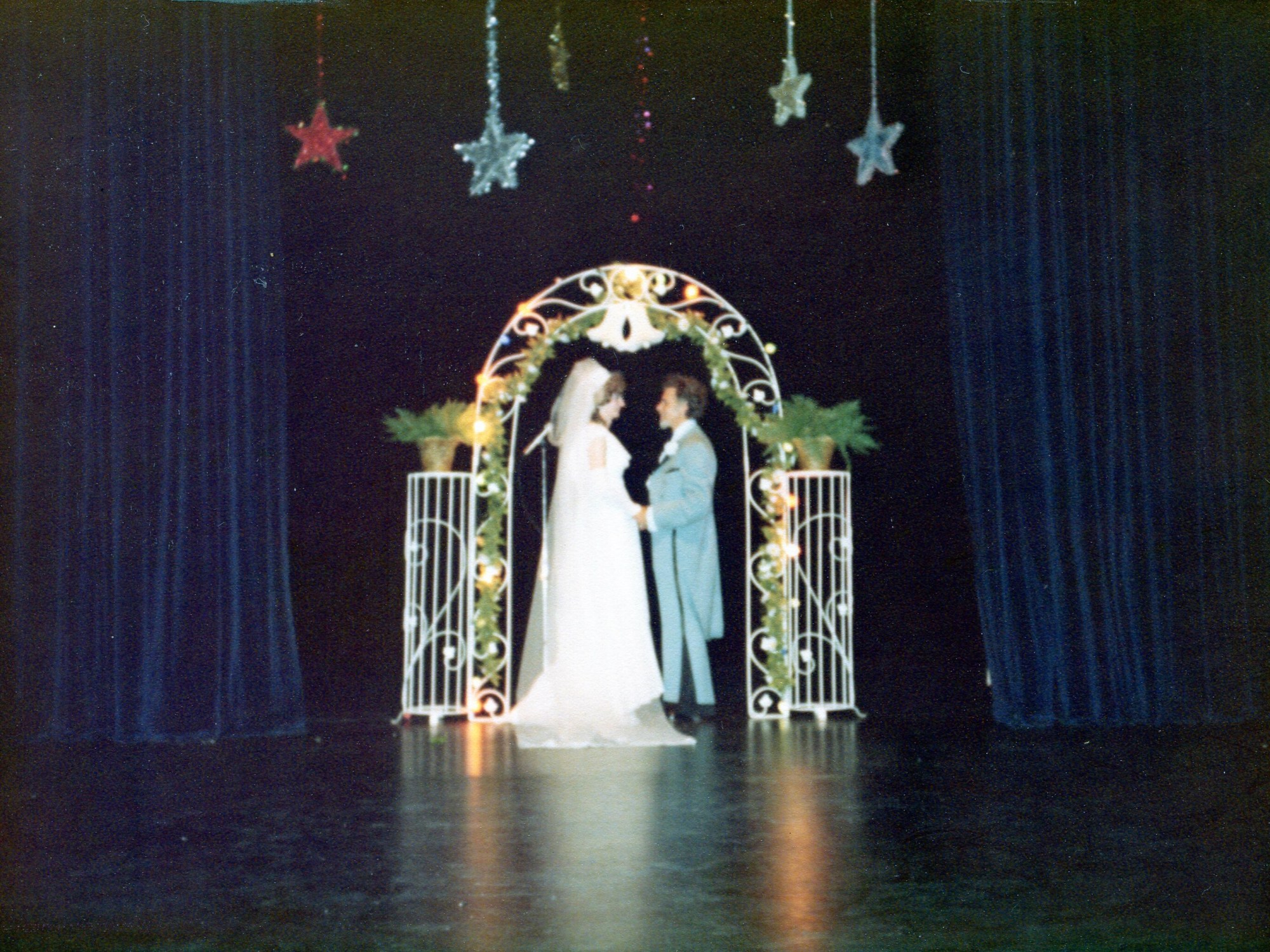 She then came down the aisle from the back of the theatre, dressed in a wedding gown, and they were married on stage.