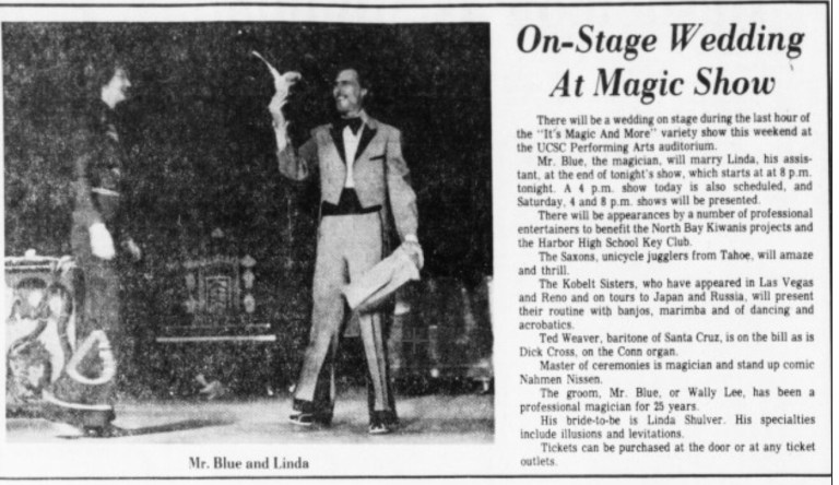 My Aunt Linda met “Mr. Blue” in the mid-1970s, and soon became his magic assistant, “Linda Lovely”.