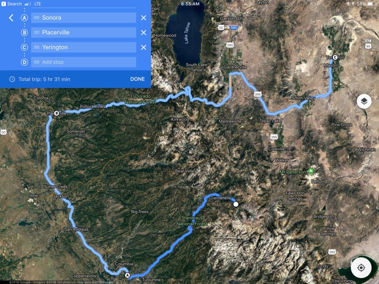 So, instead of a 91-mile trip, I had to take the long way, back West out to Sonora, up to Placerville, and over the pass(es) on Highway 50.