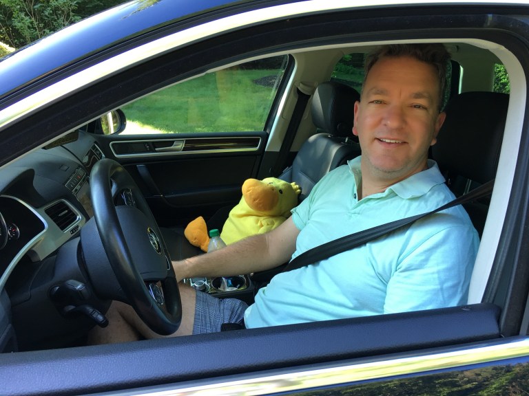Back by popular demand, Hug E. Pillow will be my co-pilot until Glenn joins me in Washington in August. He’d be a better navigator if he could see over the dashboard (Hug E. Pillow, I mean).