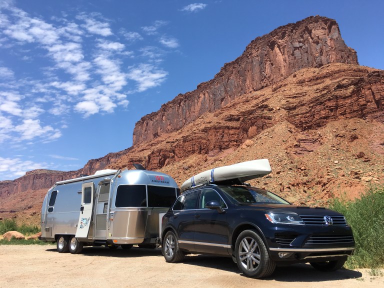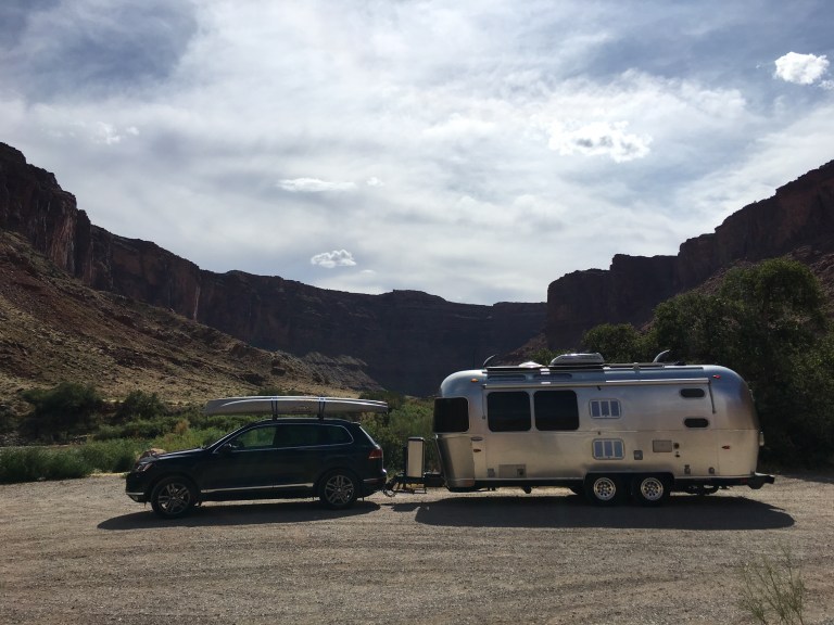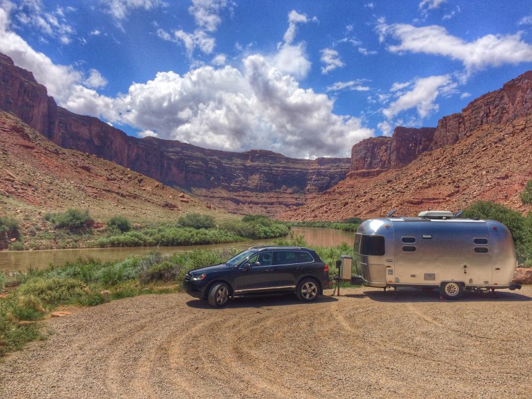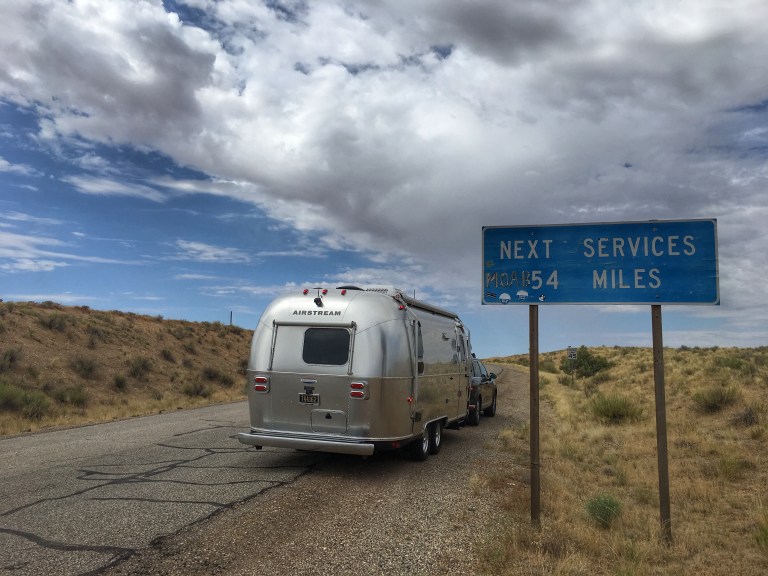 My favorite way to get to Moab from the East is via Cisco, UT on State Route 128. It’s a little bumpy, and under construction, but it takes me back in time. And I don’t care if the next services are in 54 miles – I’m towing my own bathroom.