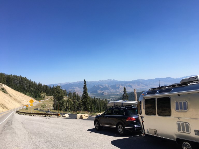Highway 33/22 over the pass from Victor, ID into Jackson, WY is not as easy as it looks, even following a slow truck. The temperature gauge climbed a bit, and on the way down, there was a bit of brake smell. I pulled over to let things cool off.