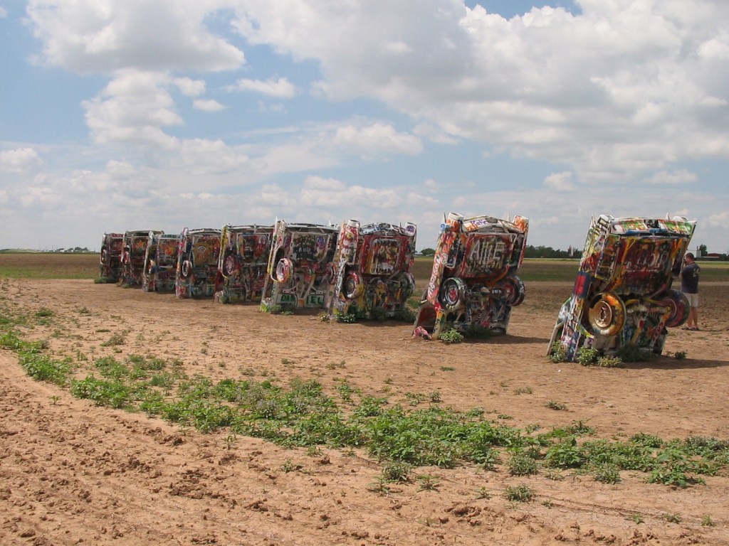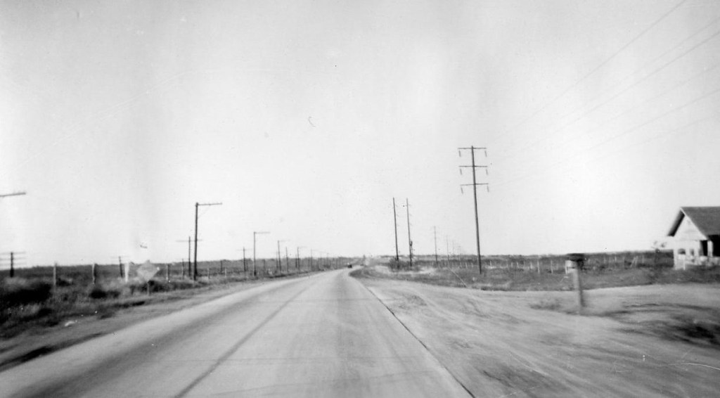 When I can’t find the telltale orange pavement, I make a travel game out of looking for long rows of old telephone poles next to railroad tracks – usually a good place to look. Oklahoma has some beautiful intact sections of that original pavement you can still drive on. Narrow, with a lip on the right edge of the lane. Large sections of concrete with seams every 30 feet. Grass growing in the gaps. In Texas you can see it dissolve in and out of frontage roads and overpasses built decades later.