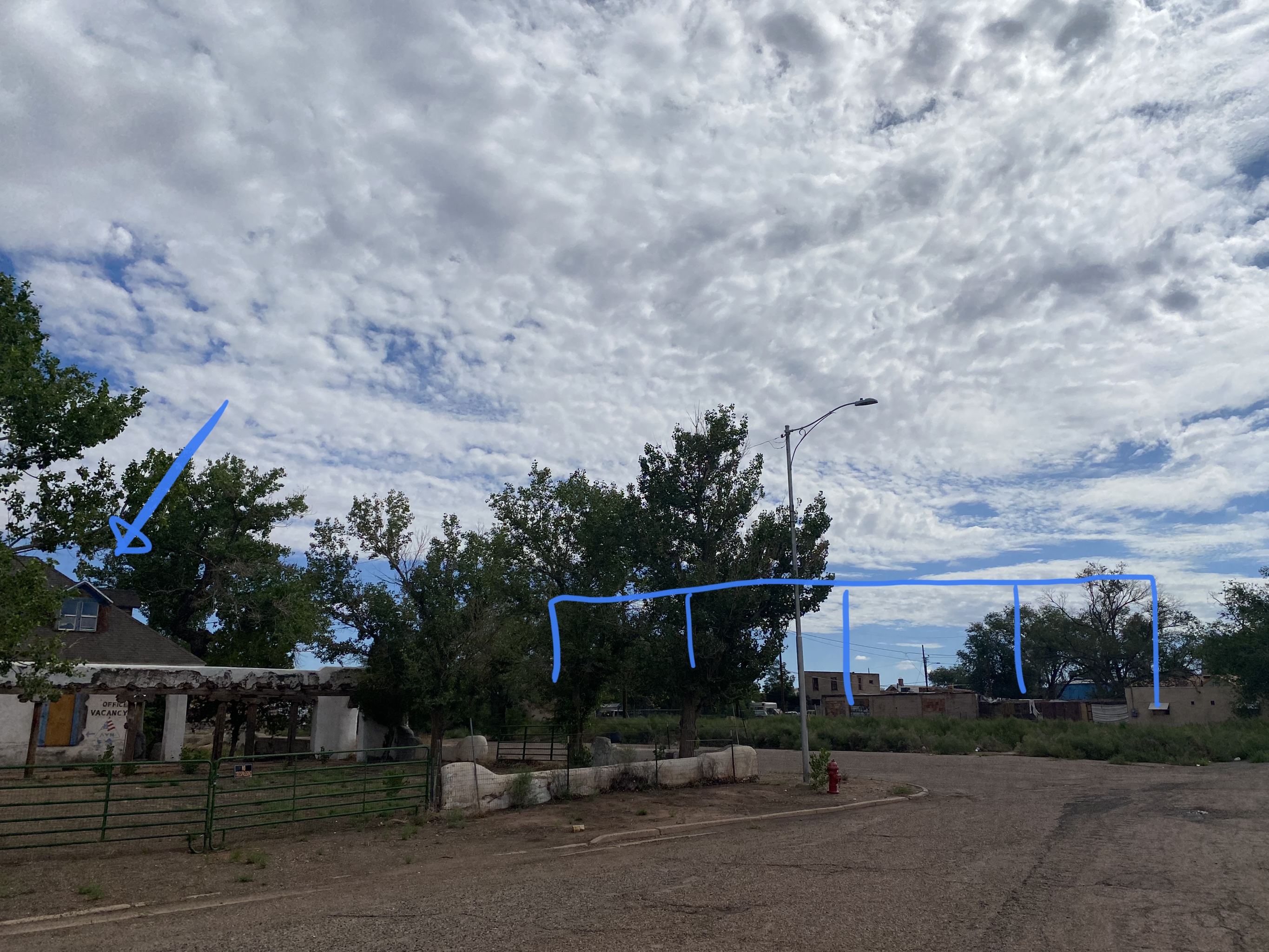 A gentleman in his 80s at the Wigwam Motel didn’t remember that hotel exactly, but drew me a map to where he thought it might be. Over the railroad tracks. Behind an old corner bar. Make a left at the waste transfer station and go down the dead-end street (thanks to a new overpass).