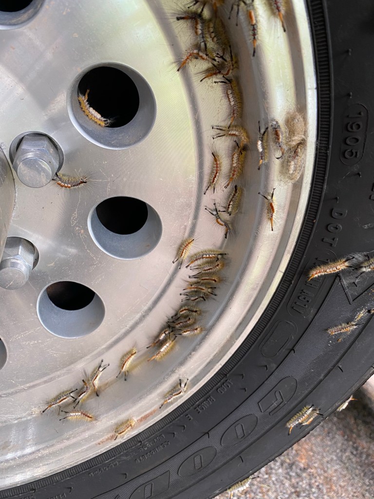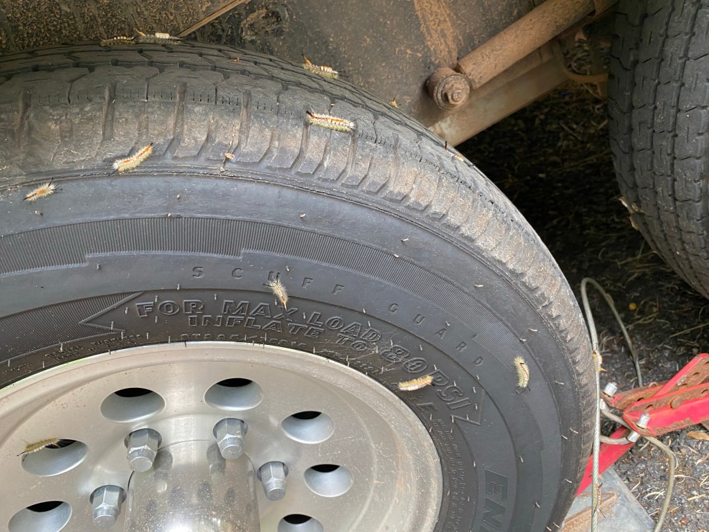 Then I made my bi-weekly campground move across the street to Black Canyon campground. At first, there were just a few of these caterpillars. Just a few, and basically only on the tires.
